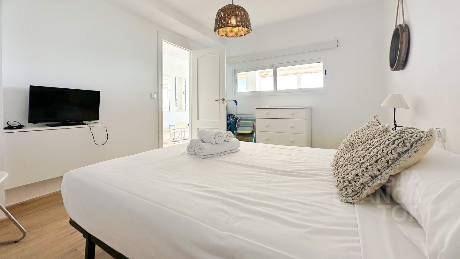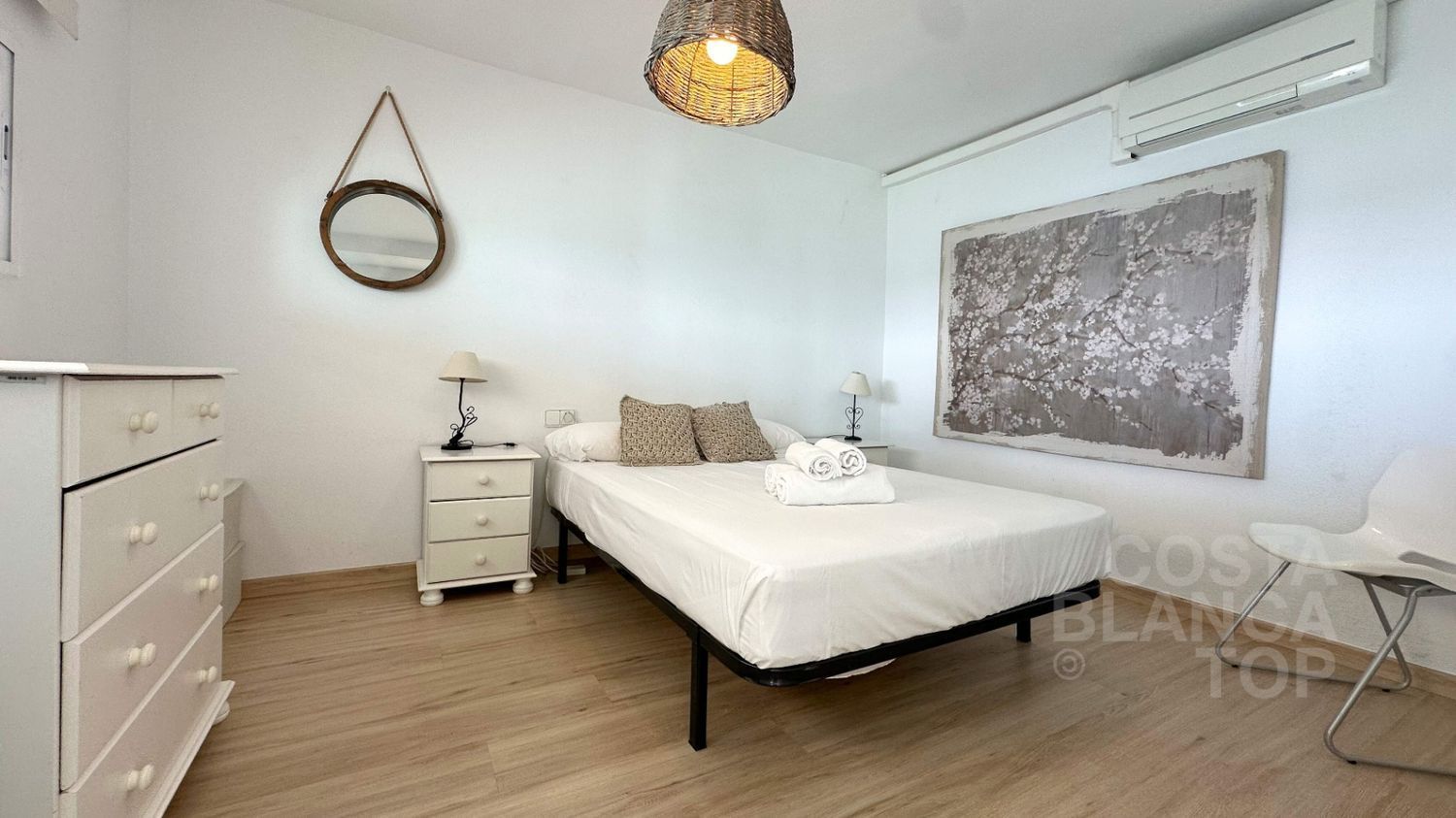 El apartamento dispone de dos dormitorios y un baño con ducha, destacando su mobiliario moderno y su equipamiento completo, incluyendo aire acondicionado y calentador eléctrico.