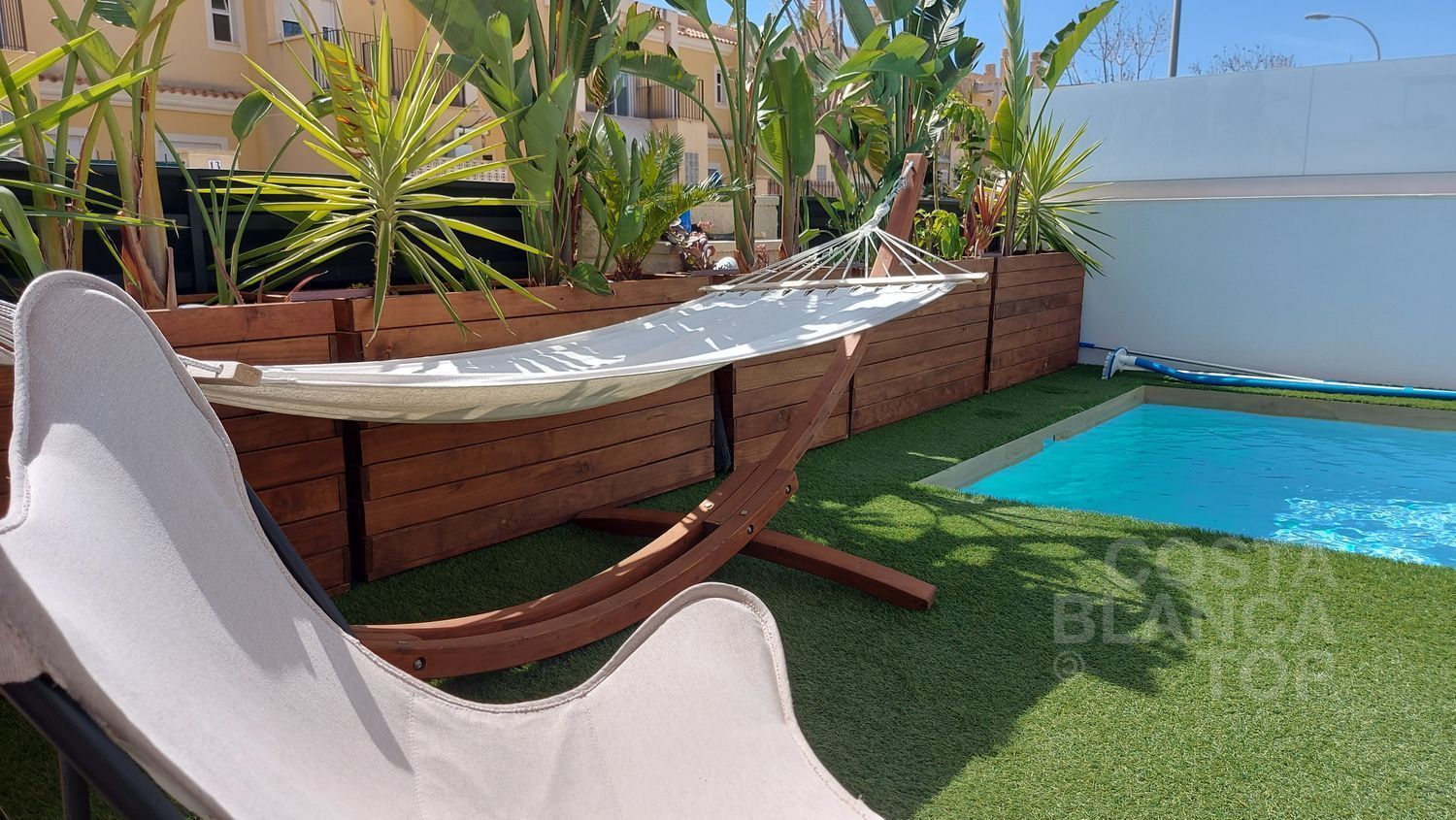Parcela con piscina propia, depuradora y zona de césped artificial. En la parcela también se encuentra a pie de calle el garaje con pérgola y puerta de entrada mecanizada.