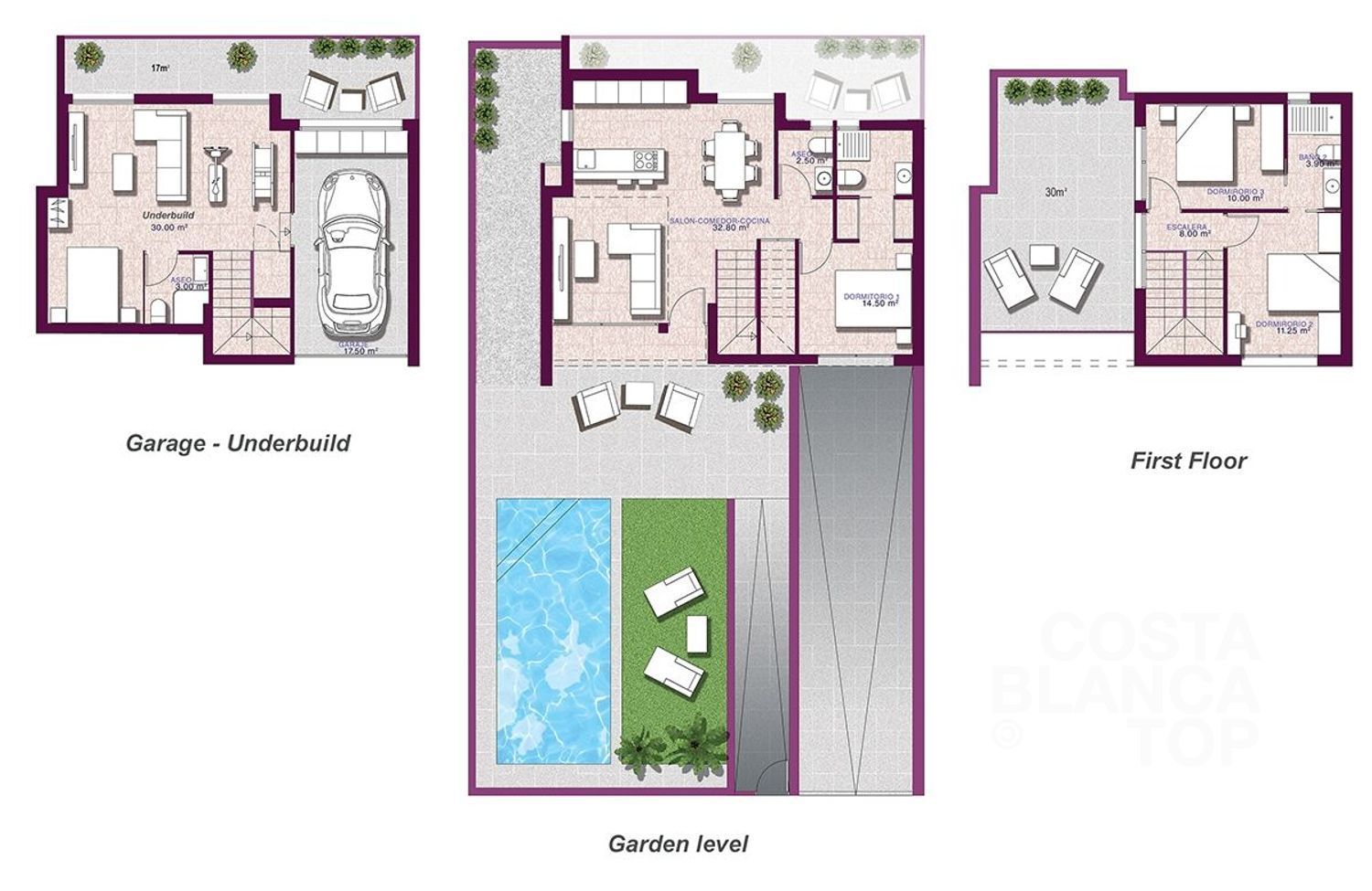 Planta Calle: Con salón y cocina de concepto abierto. Baño de cortería en planta calle. Dormitorio principal con salida al jardin y con baño en suite.