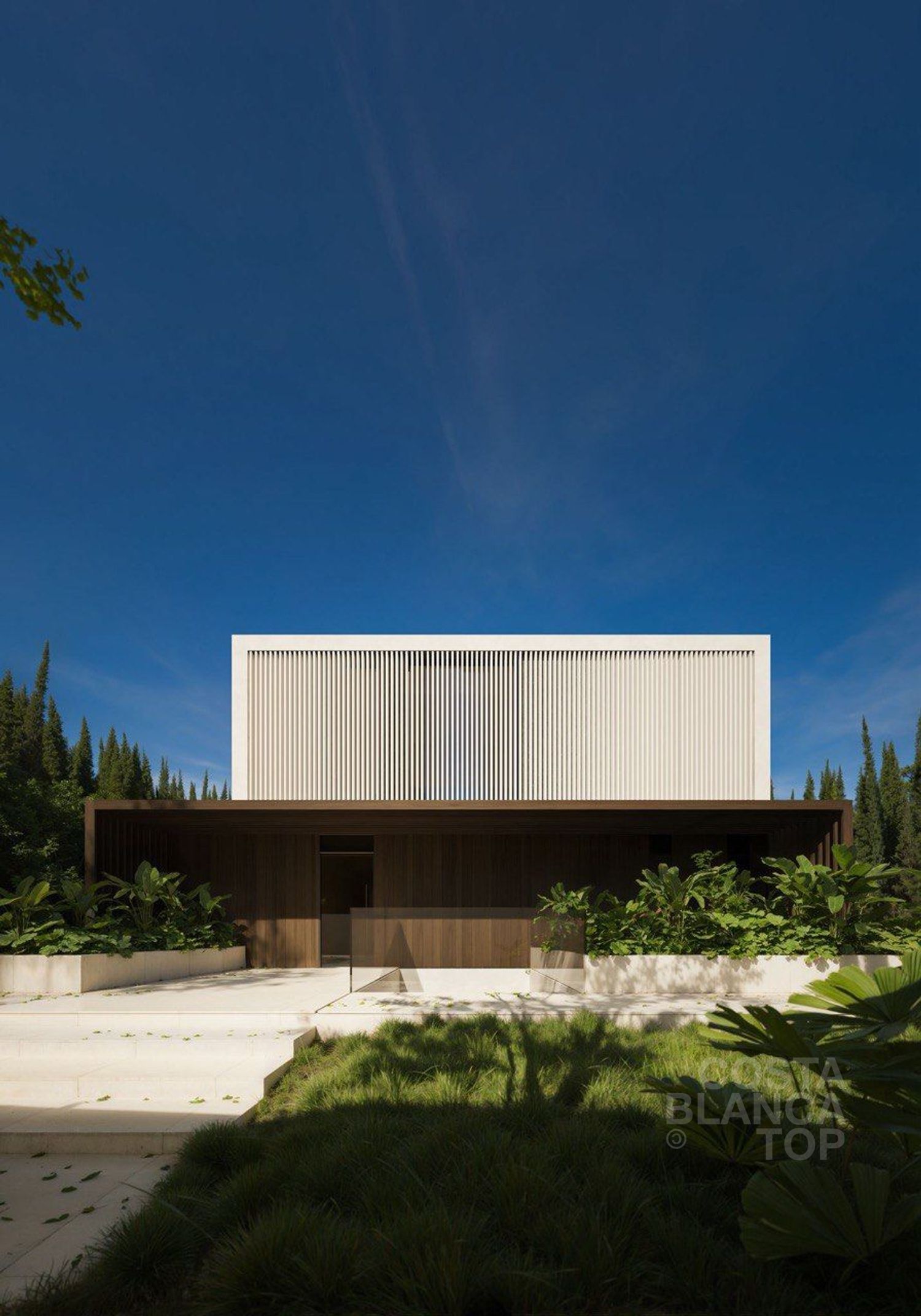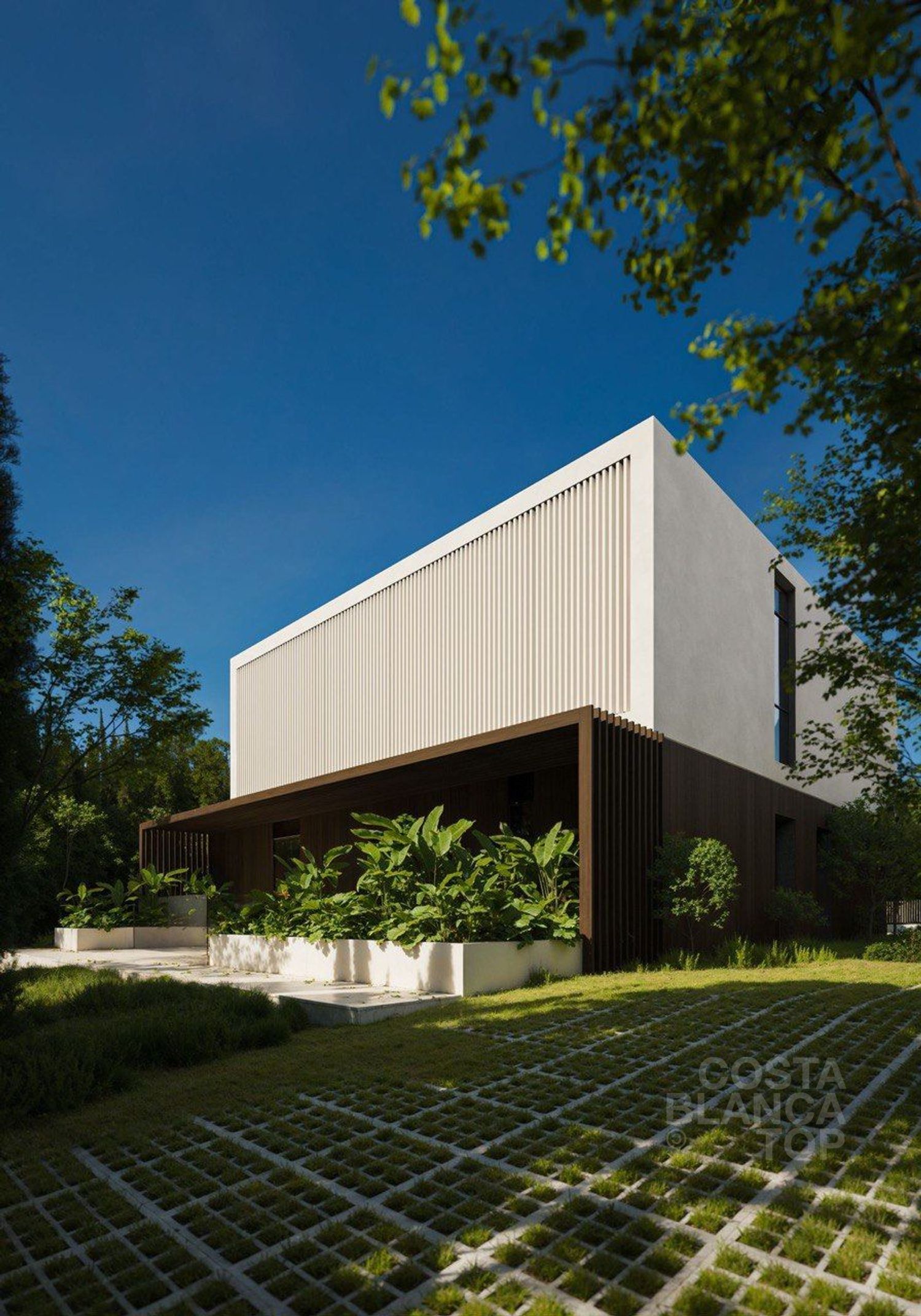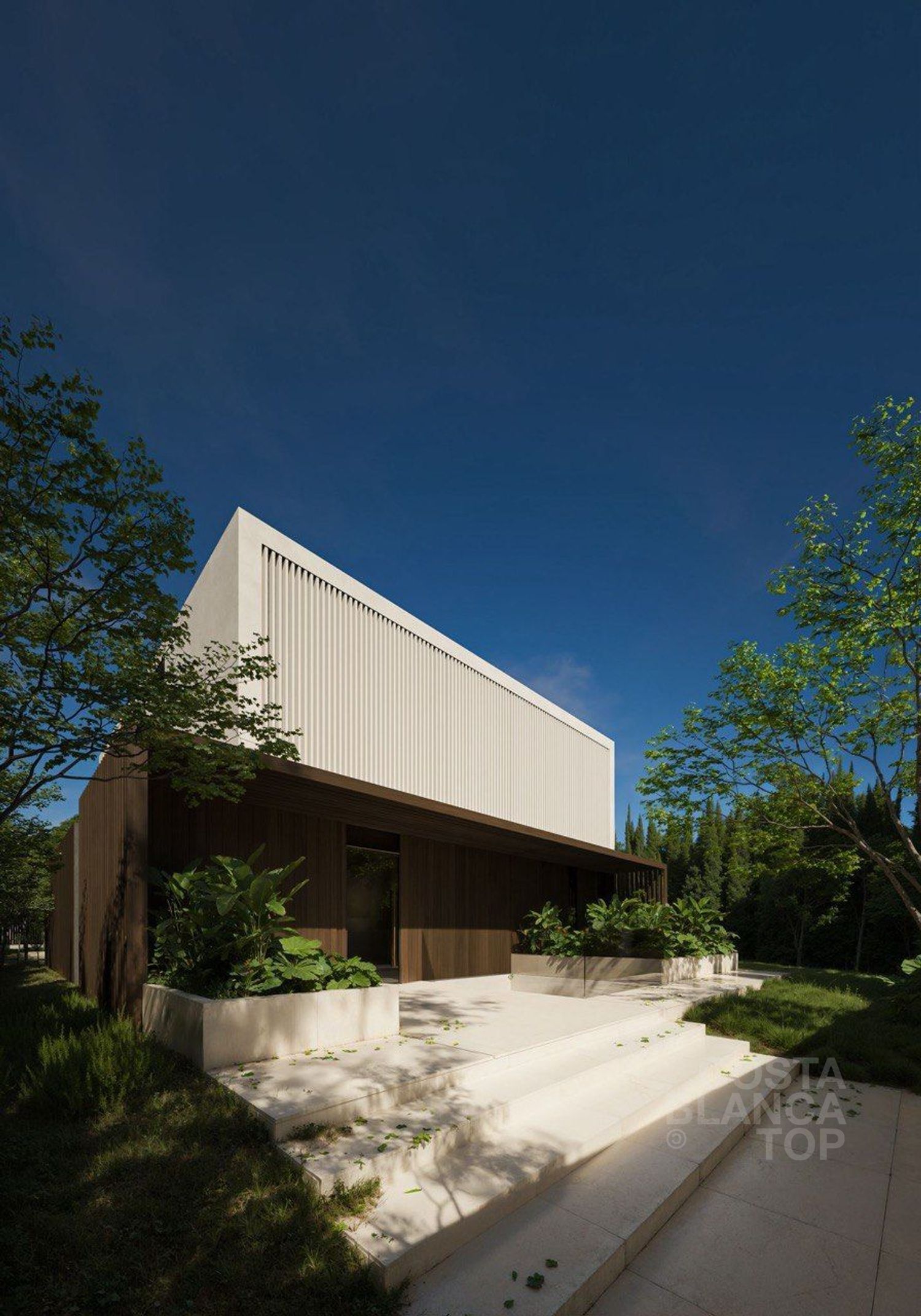 •Fachada combinada en madera composite, porcelánico oscuro y tonos crema
